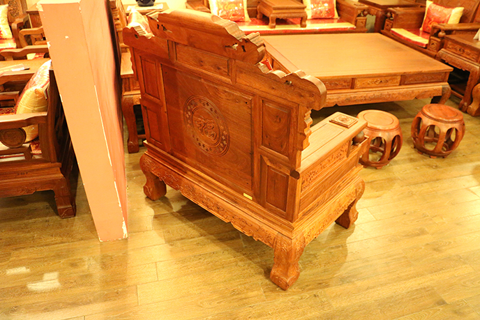 第三是中國的語言,它是紅木家具中出現頻率最高的圖案,福字紋、萬字紋、喜字紋、壽字紋,工匠們喜歡用文字來表達自己的美好祝福,給居室多增添生活氣息,掩蓋紅木家具給人的硬朗、威嚴的感覺。除了單個字體的文字外,其椅背等處還多見一些短語、警句、吉祥語或詩句,它們經過特殊的美化變形處理后,也極具觀賞價值。