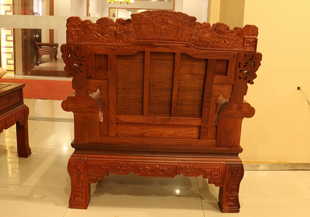 該款沙發整體的特點,較之其他沙發款式顯得更為豐滿完整,其靠背板處的鏤空面積極少,僅單單在背板的底部靠近扶手的左右兩側以及其上方懷抱元寶的兩處侍童處存有。在背板的最上端,左右兩側,雕刻有兩只憨態可掬而又威風凜凜的麒麟,然后在其中間位置,則是一對母子在簾倚之下倚靠著圓凳幸福生活的溫馨畫面。談到麒麟,在民間有"麒麟送子"的說法,它對老百姓而言,是送子神獸,據傳中國古代大思想家孔子即為麒麟所送,它是吉祥的象征,可以為人們帶來子嗣,也可保佑其平安聰慧賢德。